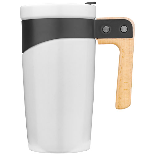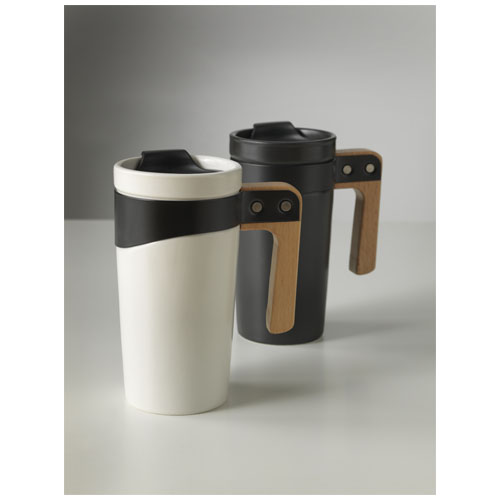 Taza de cerámica, acabado mate y mango de madera natural, combinado con acero inoxidable negro. Tapa deslizante con bloqueo incluido. Volumen 475ml. Presentado en una caja de regalo.