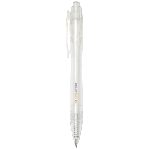 Bolígrafo con mecanismo de presión y cuerpo transparente. El cuerpo está fabricado con botellas de agua recicladas, lo que contribuye a reducir la cantidad de residuos plásticos.