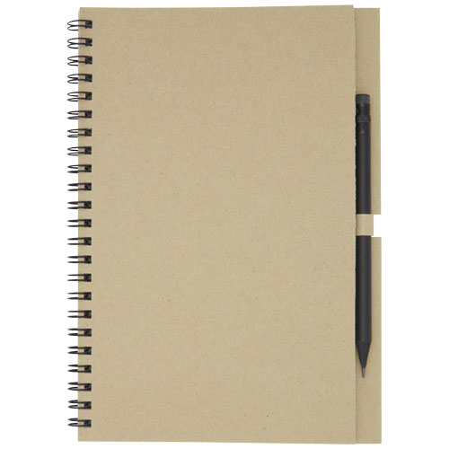 Libreta con espiral y tapa de papel reciclado con 40 hojas, de papel reciclado FSC en blanco de 80 g/m² y un lápiz negro. La libreta está hecha en Italia y el lápiz, en China.