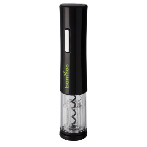 Abridor eléctrico para botellas de vino que incorpora un cortacápsulas. Funciona con 4 pilas AA (no incluidas).