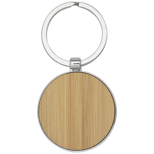 Llavero redondo de primera calidad hecho de bambú con carcasa de metal de aleación de zinc, suministrado en un sobre de papel Kraft reciclado marrón. El diámetro del llavero es de 4 cm. Apto para láser.