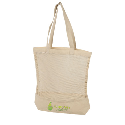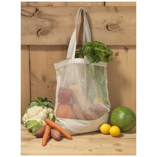 Bolsa de compra reutilizable para frutas y verduras hecha de malla de algodón. Dispone de dos asas con una longitud extensible de hasta 27,5 cm. Capacidad: 12 litros, resistencia para hasta 10 kg de peso.