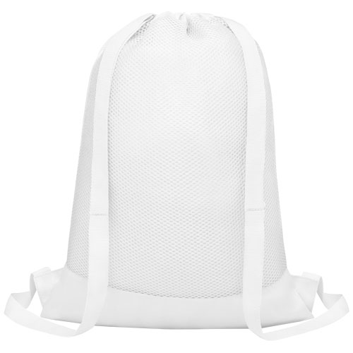 Mochila de cuerdas con compartimento principal y cierre de cuerdas en color a juego. Cuenta con correas grandes y ajustables para hombro y material de poliéster de malla deportiva. Resistencia para hasta 5 kg de peso.