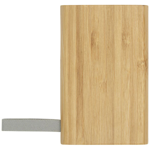 Batería externa de bambú que proporciona 5000 mAh de carga adicional para teléfonos móviles u otros dispositivos digitales. Cuenta con luces indicadoras LED y una correa hecha de PET reciclado. Incluye un cable de carga micro USB. Se suministra en una caja de regalo fabricada con material 100 % con certificado FSC e incluye un manual sobre FSC. Dado que el bambú es un producto natural, puede haber ligeras variaciones de color y tamaño en los artículos, lo que puede afectar al resultado final de la grabación.