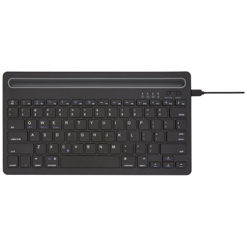 Teclado QWERTY compacto con 78 teclas. Bluetooth® 3.0 con soporte de doble canal para que pueda conectarse con dos dispositivos simultáneamente. Soporte de acoplamiento integrado para un teléfono y una tableta. El teclado es compatible con ordenadores de sobremesa/portátiles, tabletas, teléfonos móviles, televisores inteligentes y otros dispositivos con función Bluetooth®. Tiene un alcance operativo de hasta 10 metros. La batería recargable integrada de 150 mAh proporciona al menos 40 horas de uso, o hasta 6 meses en espera. La carga dura aproximadamente tres horas. Se entrega en una caja de papel kraft de primera calidad con una pegatina de colores.