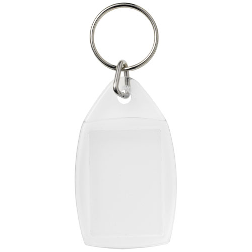 Llavero transparente con anilla abierta de metal. La anilla de metal es de perfil plano, ideal para envíos por correo postal. Dimensiones del encarte impreso: 3,5 x 2,4 cm.