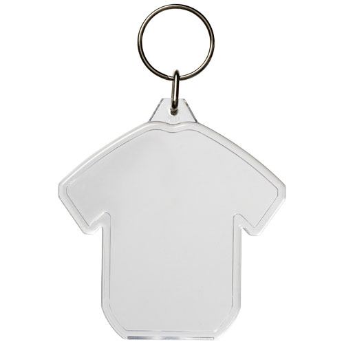 Llavero transparente con forma de camiseta con anilla abierta de metal. La anilla de metal es de perfil plano, ideal para envíos por correo postal. Dimensiones del encarte impreso: 6 x 3,8 cm.