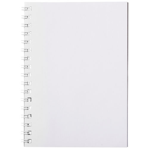 Libreta A6 con espiral «Desk-Mate®». Incluye 50 hojas en blanco de papel de 80 g/m2, una cubierta frontal de cartulina brillante (250 g/m2) y una cubierta de polipropileno transparente de 450 micras. Espiral negra o blanca. Impresión a todo color disponible en la cubierta y en cada hoja.