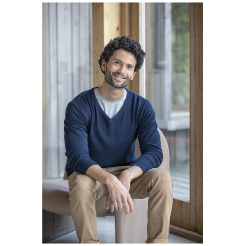 Jersey Stanton con cuello de pico para hombre: una mezcla perfecta de sofisticación y diseño clásico con cuello de pico. El cuello, los puños y el dobladillo inferior en punto liso no sólo le dan un aspecto elegante, sino que también aportan mayor comodidad. Confeccionado con una mezcla de viscosa y nailon en punto liso de galga 12, este jersey consigue el equilibrio perfecto entre estilo y funcionalidad. Este punto de galga tan fino da como resultado un tejido más suave y refinado, perfecto tanto para las ocasiones formales como para dar un toque de elegancia a tu look diario.